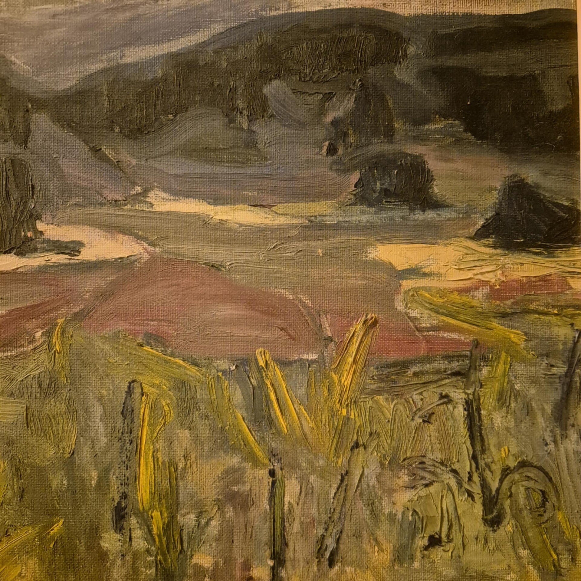 Kraftige penselstrøg, hvor marker, bakker og en dramatisk himmel skaber bevægelse og en rå, sanselig stemning.