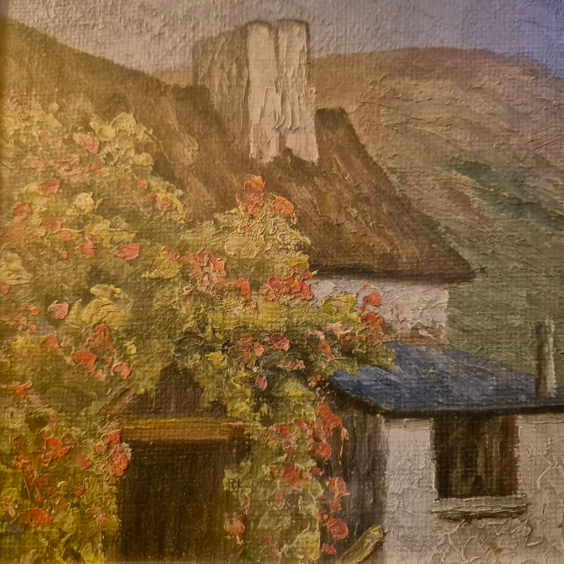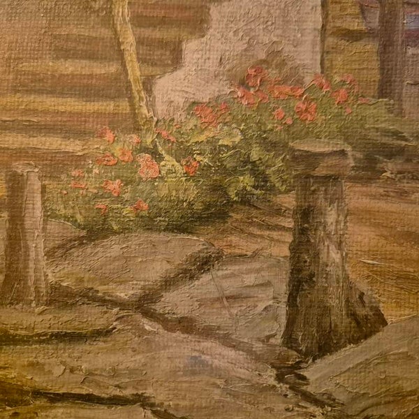 To stemningsfulde landskabsmalerier, der tilsammen danner et sammenhængende motiv af et idyllisk landsbymiljø med blomstrende huse, trapper og en rolig havnekant.